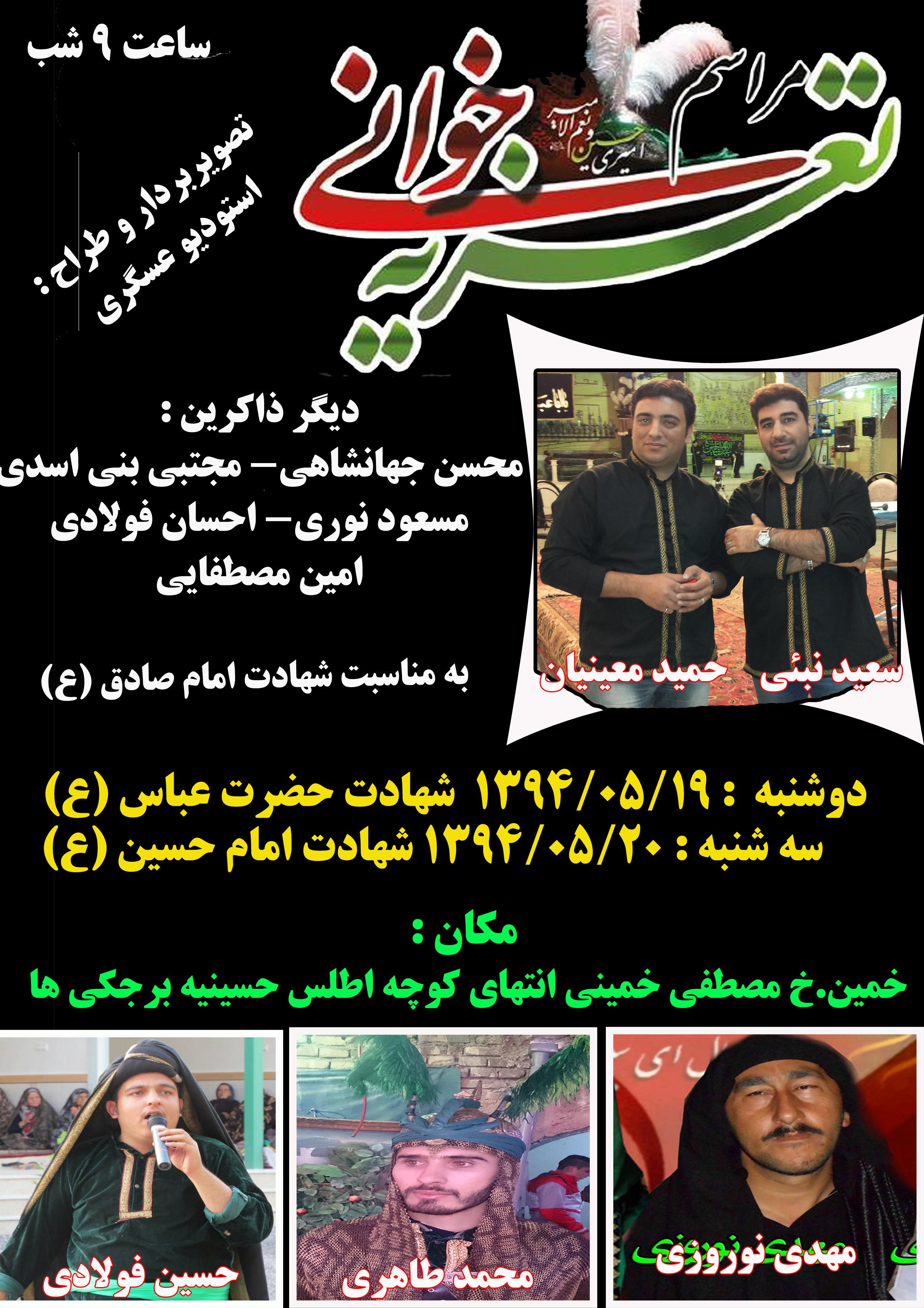 این حسین کیست که دلها همه دیوانه اوست این چه شمعیست که جانها همه پروانه اوست باعرض سلام به اطلاع کلیه عزیزان می رساند این وبلاگ توسط استودیو عسگری طراحی شده که خدمات قابل ارائه از طرف این استودیو به شرح زیر است: اولین موسسه فيلمبرداري از مجالس به صورت حرفه ای با میکس سر صحنه در استان مرکزی وشهرستان تفرش - تأمين مداح و تعزیه خوان جهت مجالس عزاداری - فروش و ارسال سی دی تعزیه به سراسر کشور همراه با پست سفارشی - تهیه نسخه و لباس تعزیه در هر زمینه - تهیه اکو و میکسر صدا جهت مجالس و... آدرس : تفرش خيابان آيت الله سعيدي خیابان شهیدباهنر -جنب پارچه فروشی بیاتی-- بهمن تلفن : 08636235588-09183489184-09366504649 ایمیل : Masgari94@yahoo.com
