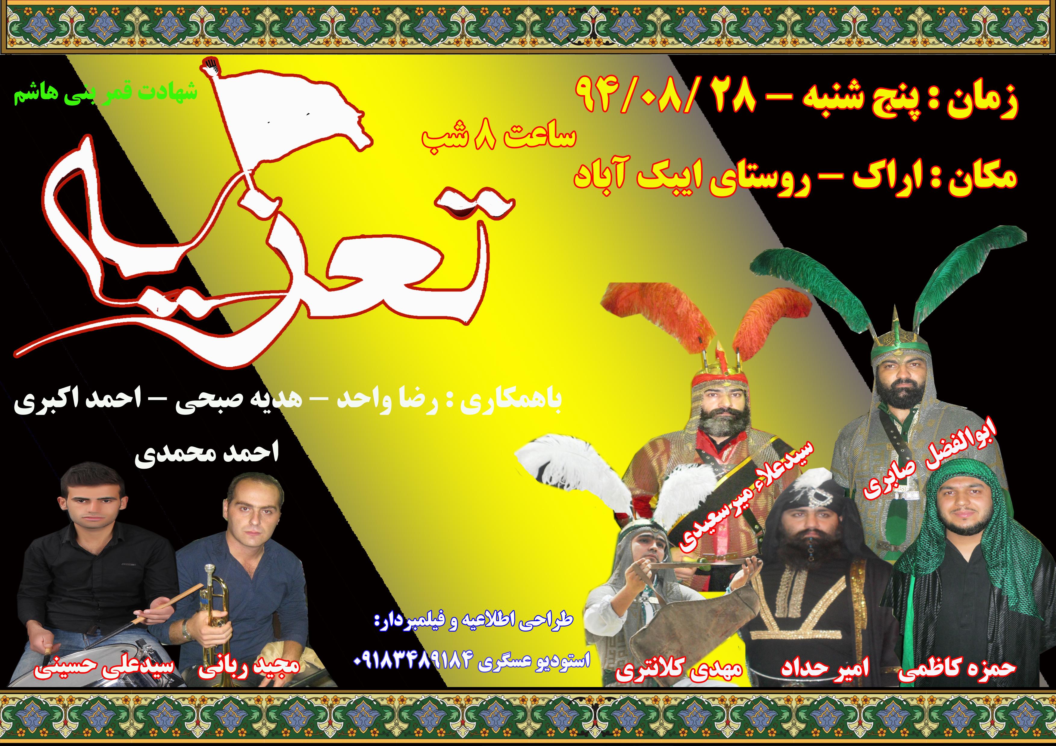 این حسین کیست که دلها همه دیوانه اوست این چه شمعیست که جانها همه پروانه اوست باعرض سلام به اطلاع کلیه عزیزان می رساند این وبلاگ توسط استودیو عسگری طراحی شده که خدمات قابل ارائه از طرف این استودیو به شرح زیر است: اولین موسسه فيلمبرداري از مجالس به صورت حرفه ای با میکس سر صحنه در استان مرکزی وشهرستان تفرش - تأمين مداح و تعزیه خوان جهت مجالس عزاداری - فروش و ارسال سی دی تعزیه به سراسر کشور همراه با پست سفارشی - تهیه نسخه و لباس تعزیه در هر زمینه - تهیه اکو و میکسر صدا جهت مجالس و... آدرس : تفرش خيابان آيت الله سعيدي خیابان شهیدباهنر -جنب پارچه فروشی بیاتی-- بهمن تلفن : 08636235588-09183489184-09366504649 ایمیل : Masgari94@yahoo.com