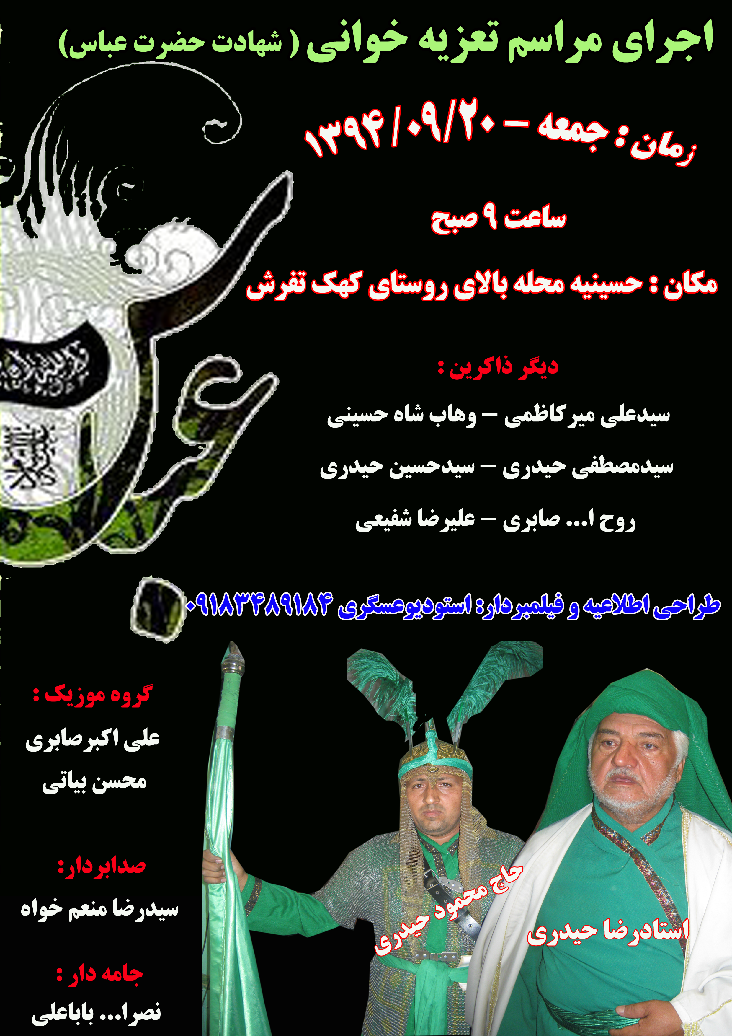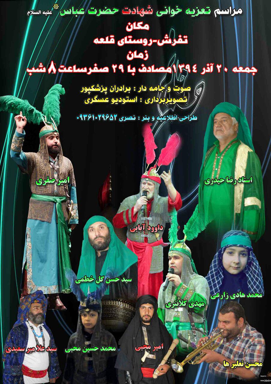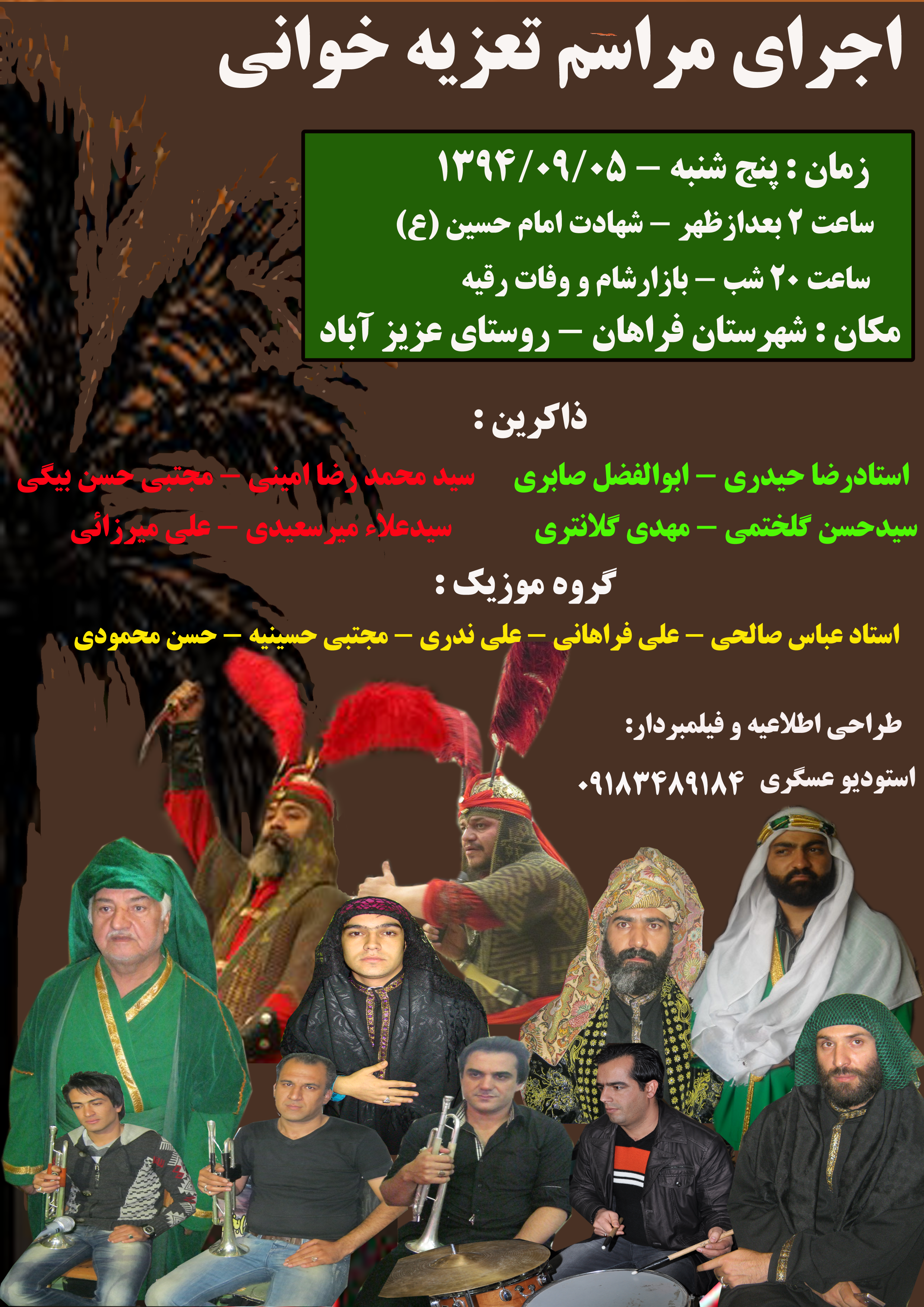 به اطلاع اهالی تعزیه میرساند باخبر شدیم پدر بزرگوار آقای قاسم برزآبادی (نوازنده ترومپت تعزیه دراراک)در 16/9/94 دارفانی را وداع گفته اند.لذا مراسم تشییع پیکر آن عزیز سفرکرده امروز 3شنبه 17/9/94 درساعت 5/10 صبح درروستای برزآباد فراهان برگزارمی گردد.ضمناً درهمین روز بعدازصرف ناهار که توسط بازماندگان فراهم گردیده شده ساعت 2بعدازظهر نیز مجلس ختمی درهمان روستا منعقد می باشد.